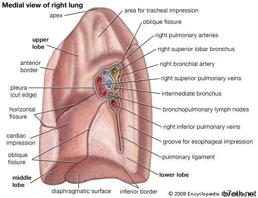 في الجانب الداخلي من كل رئة ، حوالي ثلثي المسافة من قاعدتها إلى ذروتها ، هو hilum ، النقطة التي تدخل فيها القصبات الهوائية والشرايين والأوردة الرئوية والأوعية اللمفاوية والأعصاب. تنقسم القصبات الرئيسية عدة مرات بعد دخول الرئة. يشبه نظام الأنابيب الناتج شجرة مقلوبة. تتناقص أقطار القصبات الهوائية في النهاية إلى أقل من 1 مم (0.04 بوصة). فروع 3 مم وأقل في القطر المعروف باسم القصبات الهوائية ، والتي تؤدي إلى الأكياس الهوائية الدقيقة تسمى الحويصلات الهوائية (نرى الحويصلات الهوائية الرئوية) ، حيث يتم تبادل جزيئات الغاز الفعلية من الأكسجين وثاني أكسيد الكربون بين المساحات التنفسية والشعيرات الدموية.