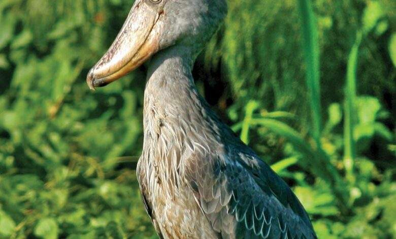 مع منقار ضخم منمق ، فإنه يطارد مستنقعات شمال شرق أفريقيا بسبب فرائسها المفضلة ، وهي الرئة البدائية. على الرغم من أنه قد يفضل نسيج سمك الرئة ، المغلف بالمخاط الزلق ، فإن shoebill لا ينفر من أزمة إضافية. كما يستنشق السلاحف والتماسيح الصغيرة. حمامة فيكتوريا توج