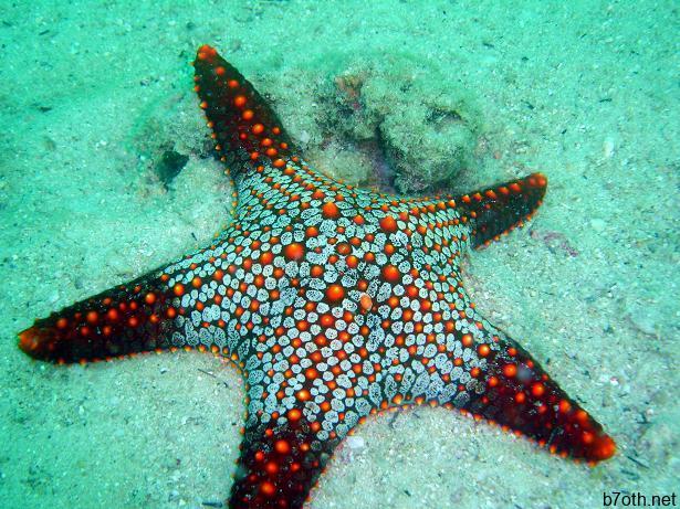 نجم البحر (قنديل البحر). (إلى اليسار) وقنفذ بحري (إلى اليمين) مثالان لقنفذيات الجلد. ويظهر في نجم البحر بوضوح تناظر الأضلاع الخمسة للمجموعة.