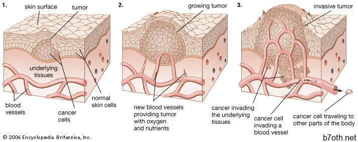 ورم خبيث هو بالتالي السمة المميزة للخباثة. ورم خبيث هو ميل الخلايا السرطانية التي يتم نقلها من موقعها الأصلي عن طريق الجهاز الدوري والقنوات الأخرى ، مما قد يؤدي في النهاية إلى إنشاء هذه الخلايا في كل أنسجة وأعضاء الجسم تقريبًا. في المقابل ، تظل خلايا الورم الحميد دائمًا على اتصال مع بعضها البعض في كتلة صلبة واحدة متمركزة على موقع المنشأ. بسبب الاستمرارية الجسدية للخلايا السرطانية الحميدة ، يمكن إزالتها بالكامل عن طريق الجراحة إذا كان الموقع مناسبًا. لكن نشر الخلايا الخبيثة ، التي تمتلك كل واحدة على حدة (من خلال الانقسام الخلوي) القدرة على توليد أورام جديدة في مواقع جديدة وبعيدة ، يتطلب استئصالًا كاملاً عن طريق إجراء عملية جراحية واحدة في جميع فترات النمو باستثناء أولها.