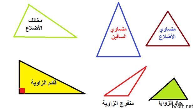 تّم تقسيم المثلثات حسب الزوايا الداخلية وأطوال الأضلاع كما يلي: حسب الزوايا الداخلية للمثلث مثلث حادّ الزوايا: هو المثلث الذي تكون جميع زواياه الداخلية حادةّ، أي قياس كل زاوية أقل من تسعين درجة.