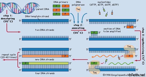 PCR هي عملية من ثلاث خطوات يتم تنفيذها في دورات متكررة. الخطوة الأولى هي تمسخ ، أو فصل ، من شقين من جزيء الحمض النووي. يتم تحقيق ذلك عن طريق تسخين مادة البدء إلى درجات حرارة حوالي 95 درجة مئوية (203 درجة فهرنهايت). كل حبلا هو قالب مبني عليه حبلا جديد. في الخطوة الثانية ، يتم تخفيض درجة الحرارة إلى حوالي 55 درجة مئوية (131 درجة فهرنهايت) بحيث يمكن للطلاء الصلب أن يصلب إلى القالب. في الخطوة الثالثة ترتفع درجة الحرارة إلى حوالي 72 درجة مئوية (162 درجة فهرنهايت) ، ويبدأ بوليميريز الحمض النووي في إضافة النيوكليوتيدات إلى نهايات الاشعال الصلبة. في نهاية الدورة ، التي تستغرق حوالي خمس دقائق ، ترتفع درجة الحرارة وتبدأ العملية مرة أخرى. يتضاعف عدد النسخ بعد كل دورة. عادة ما تنتج 25 إلى 30 دورة كمية كافية من الحمض النووي.