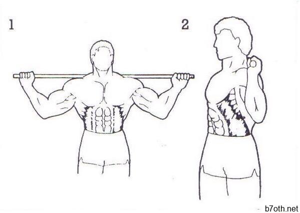 – ثم تثبيت العصا أعلى الكتفين مع مد الذراعين على طول العصا ولف منطقة الساعدين واليدين حولها.